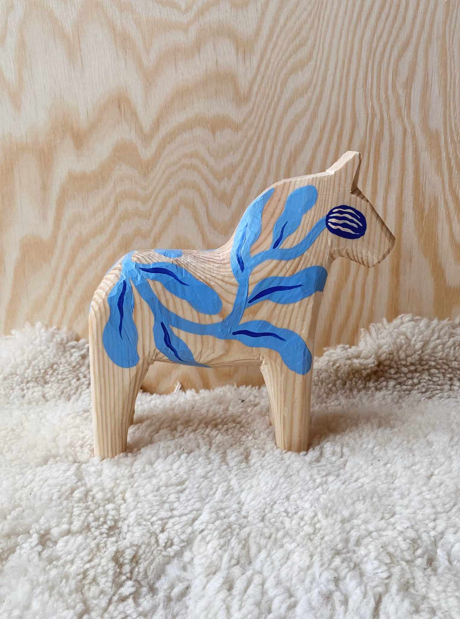 Dalahäst Limited Edition - Varje Dalahäst häst är helt unik. Denna Dalahäst har träfärgad bakgrund och är målad i en ljusblå färg med detaljer i klarblå och ljusrosa. Den är målad olika på båda sidorna men har ett sammanhängande motiv. Hästarna är handmålade, signerad, täljda för hand och mäter 20cm från fot till öra.