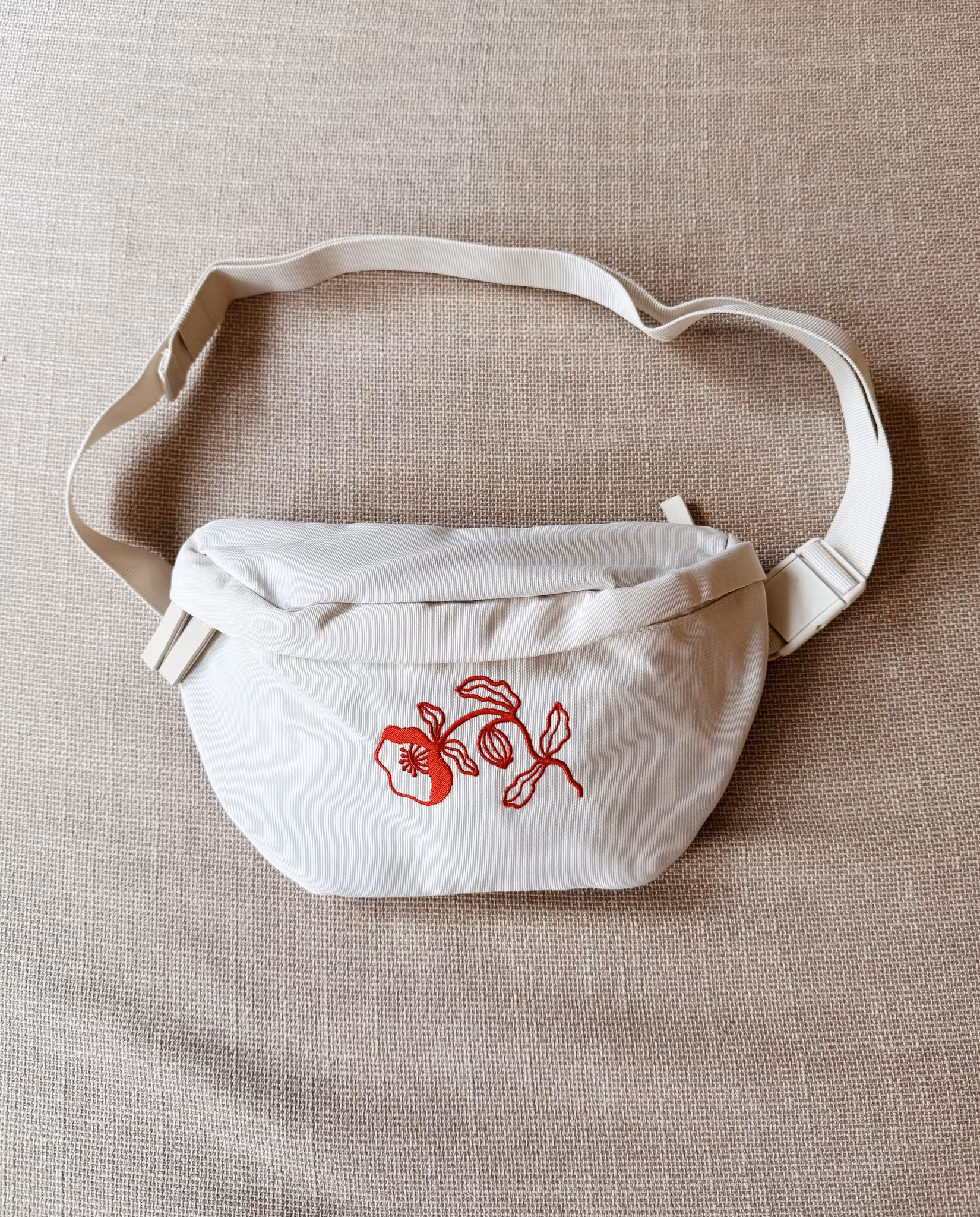 Vallmo midje/axelväska - Cross over - väska med broderad klarröd Vallmoblomma. Finns i flera färger. Gjord av 100% återvunnen polyester. Justerbart band som går att öppna med ett spänne. Väskan har tre fack, ett mindre inuti det stora och ett mindre baktill. Det stora facket och facket baktill går att stänga med dragkedja.